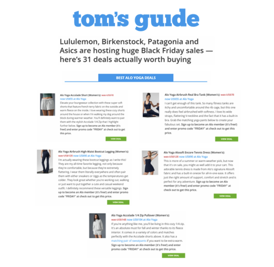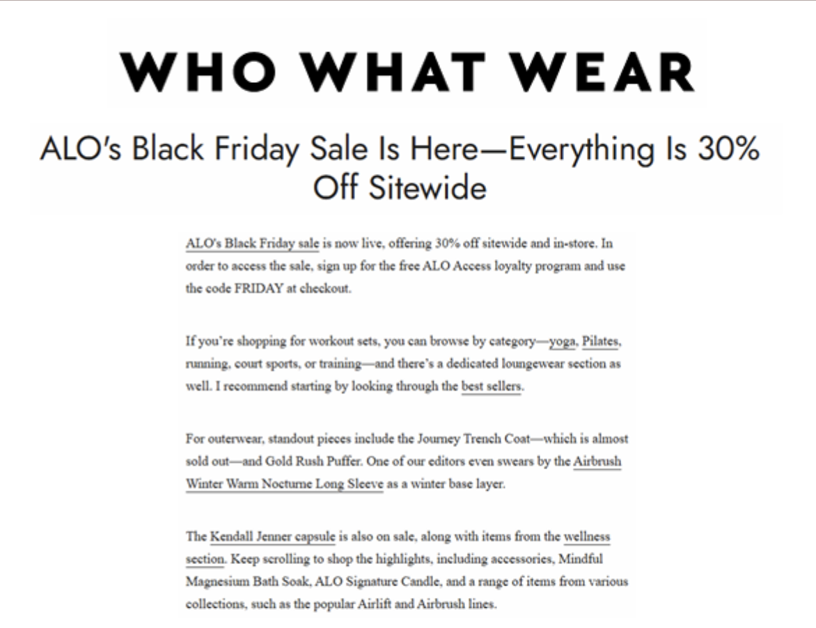 To generate buzz for their Black Friday and Cyber Monday Sales, Alo Yoga teamed up with The Brand Agency to drive maximum media impact. The agency executed a strategic press push across top-tier fashion and lifestyle outlets, targeting both women’s and men’s media to align with Alo Yoga’s broader brand messaging.